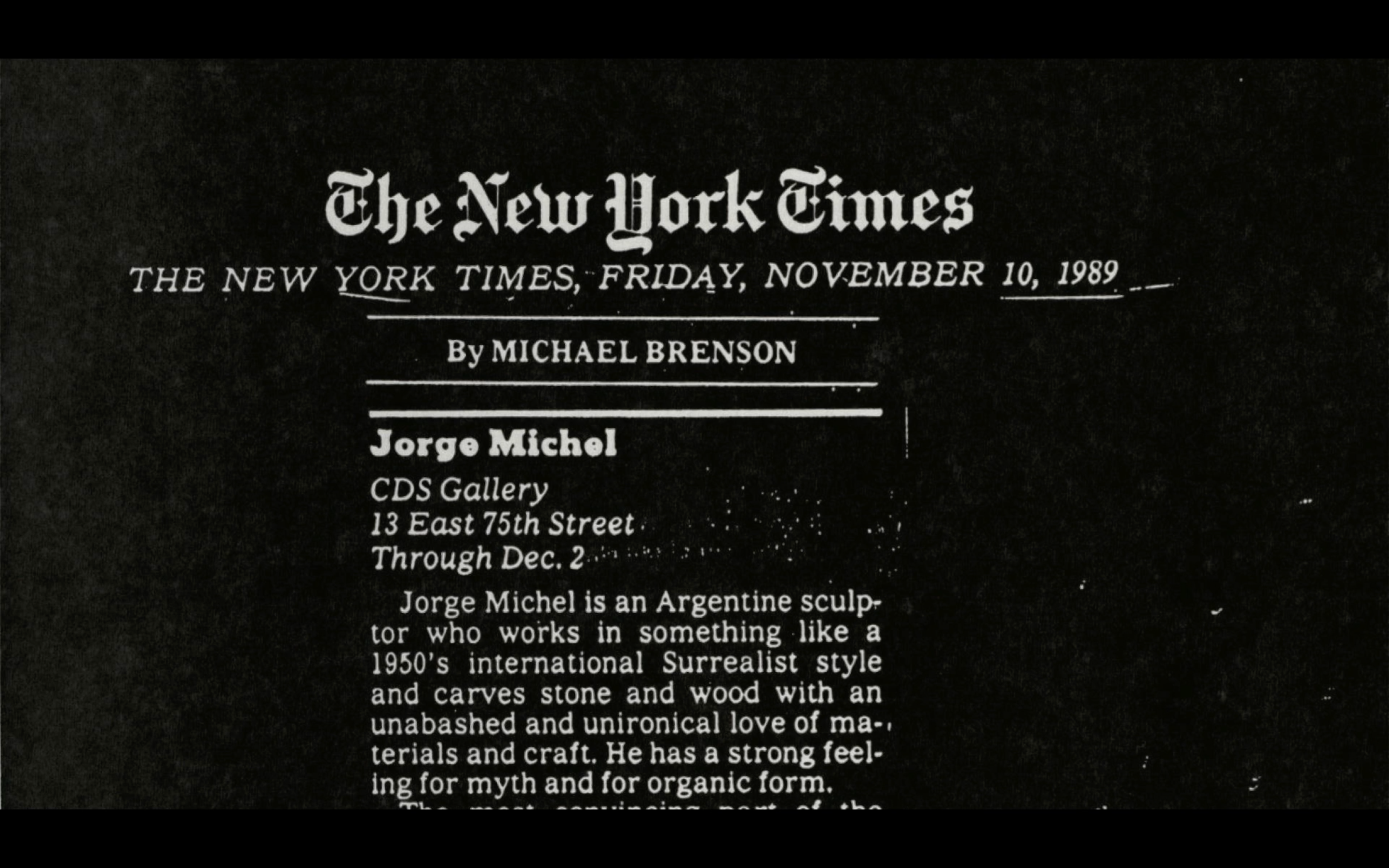 El archivo: «Arranqué teniendo muy poco archivo. Cada cosita que iba apareciendo (una ficha en el Museo Moderno, un sello con el nombre de mi abuelo, cinco recortes o fotos impresas, etc) las iba digitalizando en la mejor calidad posible. Sabía que estaba digitalizando material para una película, pero también armando el archivo de un artista. Se convirtió en una de las columnas que enriquecen la película».